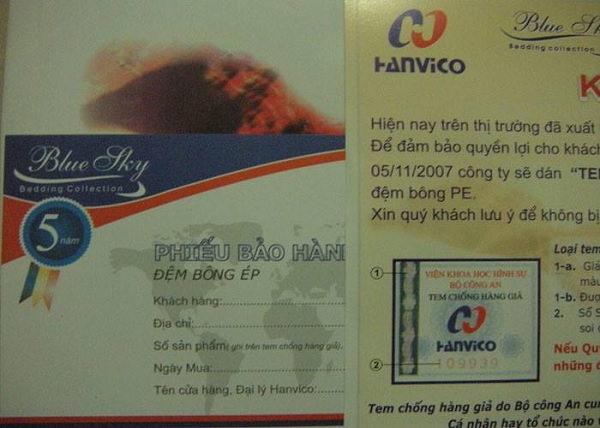Tất cả sản phẩm đệm bông ép Hanvico đều đi kèm theo một phiếu bảo hành. Trên phiếu bảo hành có các thông tin về khách hàng, năm bảo hành, số sản phẩm, tên đại lý bán và ngày mua.